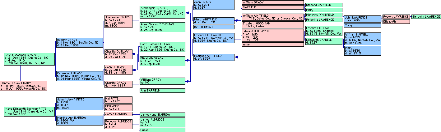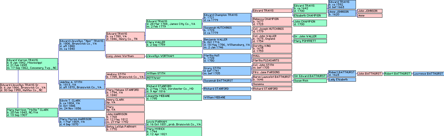 This site describes the families of my ancestors. If you want more information, or can contribute information or corrections, please e-mail me. This section contains links to six family charts; the major surnames in the charts are listed below. These charts have no links...use your browser to return back to this page. The BACON Ancestor Chart outlines families from eastern Virginia, and Kentucky (Todd Co.).Families include BACON, DICKINSON, WARE, HARRIS, ANDERSON, SANDIDGE, BOXLEY, BULLOCK, OVERTON, EDLOE, THORNTON, & TALIAFERRO.A few of these lines go back to England. Also included in this chart are two families from Connecticut who moved to Elmira, Chemung Co., NY: WELLES, and BABCOCK. The GRADY Ancestor Chart outlines families from Virginia (Dinwiddie Co.) and North Carolina (Duplin Co.).Families include GRADY, FITTZ, OUTLAW, BARROW, ALDRIDGE, THOMAS, BARFIELD, WHITFIELD, LAWRENCE, & DAFNELL. The LAWRENCE line goes back to England. The KITCHIN Ancestor Chart outlines families from eastern Virginia and North Carolina (Granville, Edgecombe, & Halifax Co.).Families include KITCHIN, ARRINGTON, ALSTON, SMITH, HODGE, BRINKLEY, CROWELL, SANDIFUR, MACON, & ATHERTON.A few of these lines go back to England. The SATTERFIELD Ancestor Chart outlines families eastern Virginia, and North Carolina (Granville, Orange, & Person Co.).Families include SATTERFIELD, NORWOOD, JORDAN, WALKER, TROTTER, PATE, THOMAS, CHURCH, HOBSON, & AIKEN.Several of these lines go back to England. The STACK Ancestor Chart outlines families from Virginia, North Carolina, South Carolina, and Tennessee (Cheatham Co.).Families include STACK, MILES, PACE, BIGGER, PARDUE, DAVIS, SHAW, GUPTON, HUNT, & RACKLEY. The TRAVIS Ancestor Chart outlines families from eastern Virginia (Jamestown, Williamsburg, & Brunswick Co.).Families include TRAVIS, CLARK, STITH, HARRISON, WORTHAM, PARHAM, WALLER, MEBANE, MYRICK, & CHAMPION.A few of these lines go back to England.Also included in this chart is one family from Maryland: STANFORD.